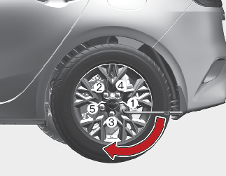 Em seguida, coloque a chave de rodas como se mostra na figura e aperte as porcas da roda. Certifique-se de que a chave encaixa completamente na porca. Não se apoie no manípulo da chave de rodas nem utilize um tubo de extensão sobre o manípulo da chave. Verifique bem a roda apertando todas as porcas seguindo a ordem numérica indicada na imagem até todas estarem apertadas. Volte a verificar o aperto de cada roda. Depois de mudar as rodas, mande verificar o sistema numa oficina profissional. A Kia recomenda que visite um concessionário/parceiro de serviços autorizado Kia.