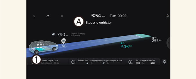 На экране выберите Электромобиль → След. отправление. Вы можете установить дату и время зарядки аккумулятора, температуру климат-контроля и другие различные функции.