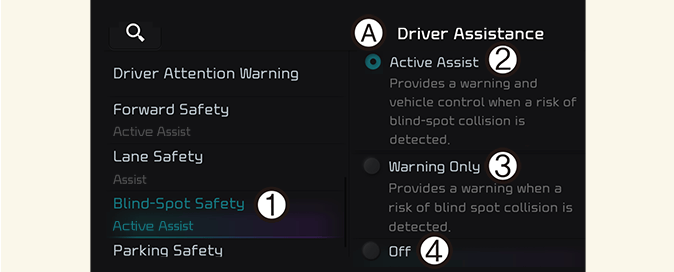 Настройки вспомогательной системы предотвращения столкновения в слепой зоне