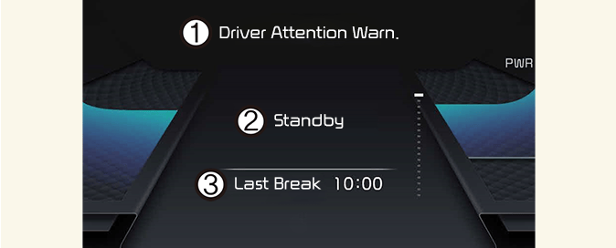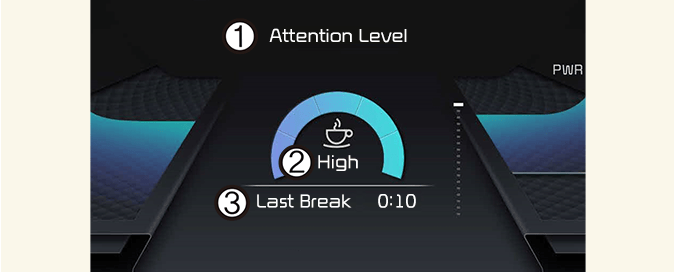 Если внимание водителя падает ниже уровня 1, на приборной панели отображается предупреждающее сообщение и выдается звуковой сигнал предупреждения о необходимости перерыва в вождении.