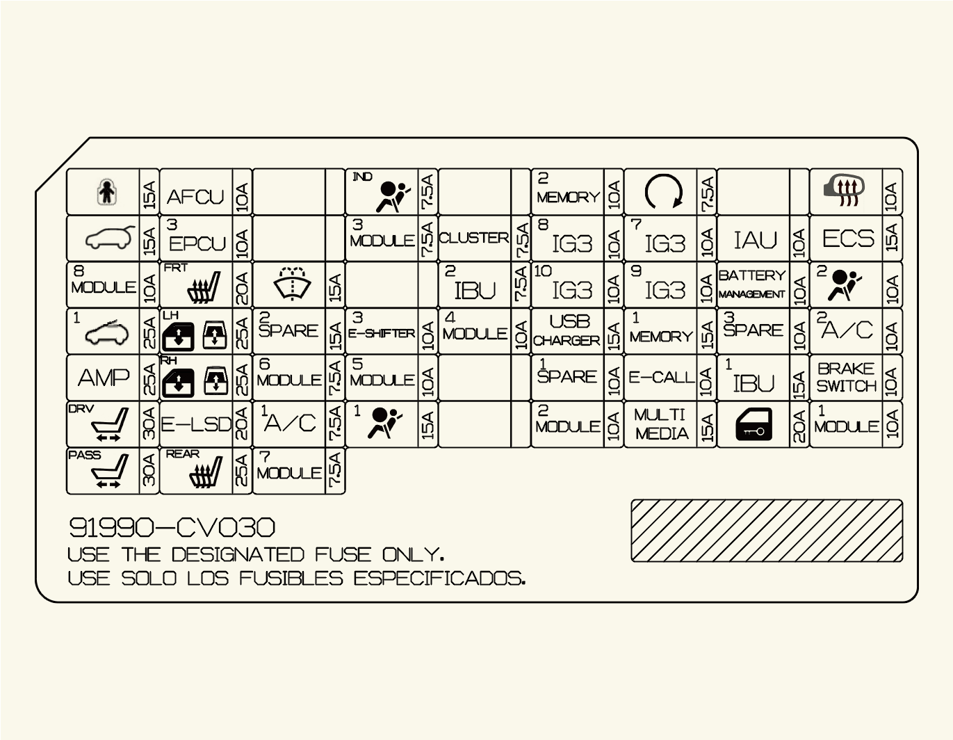Соединительная панель ICU (предохранитель: CHILD LOCK, AFCU, TAILGATE OPEN, EPCU 3, MODULE8, S/HEATER FRT, SUNROOF1, P/WINDOW LH, AMP, P/WINDOW RH, P/SEAT DRV, P/SEAT PASS, S/HEATER RR) |