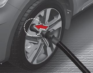 Ligue o compressor e deixe-o a funcionar durante cerca de 5 ~ 7 minutos para encher o vedante até à pressão adequada. (Consulte Mais detalhes). A pressão do pneu após o enchimento não é importante e será verificada/corrigida mais tarde. Tenha cuidado para não encher demais o pneu e afaste-se do pneu quando estiver a encher. Se o pneu e a roda estiverem danificados, não use Kit Mobilidade para Pneus para sua segurança.