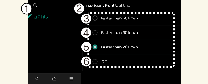 Įjungta išmanioji priekinių žibintų sistema veiks pagal informacijos ir pramogų sistemos ekrane nustatytą greitį. Pradinė sistema nustatoma veikti, kai automobilio greitis viršija 40 km/h (25 mph).
