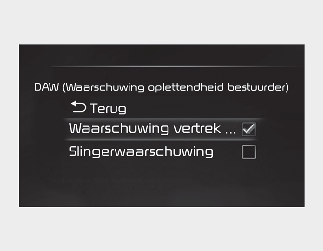 Terwijl de toets ENGINE START/STOP (Motor starten/stoppen) in stand On staat, selecteert u 'User Settings → Driver Assistance → Driver Attention Warning' ('Gebruikersinstellingen → Bestuurdershulp → Waarschuwing oplettendheid bestuurder') op het LCD-scherm of op het infotainmentsysteem om voor iedere functie in te stellen of ze al dan niet moet worden gebruikt.