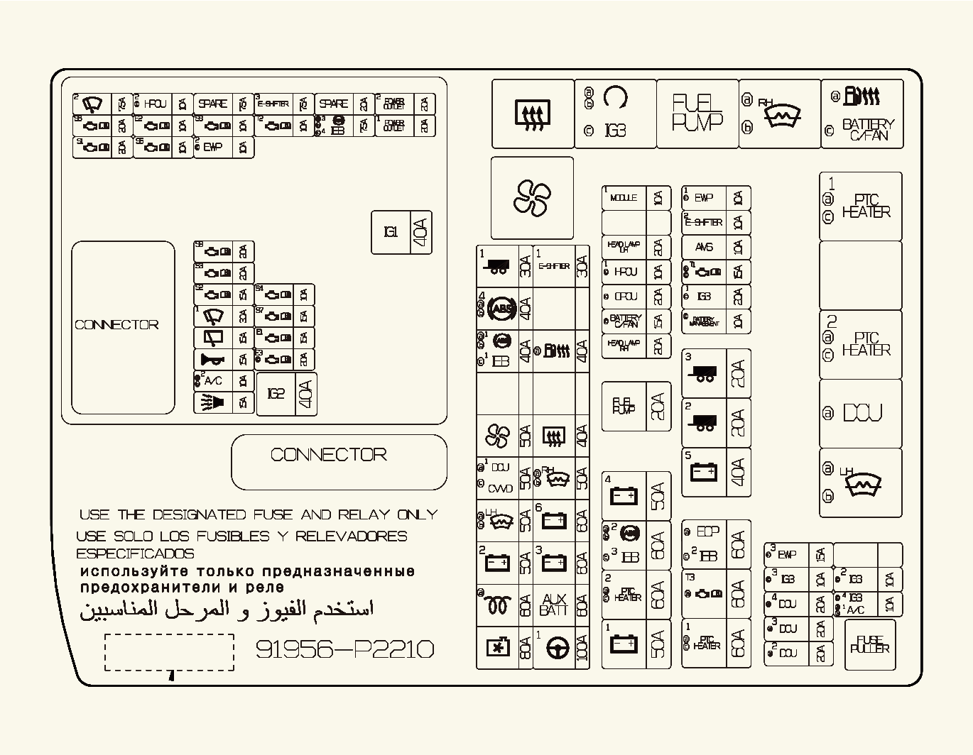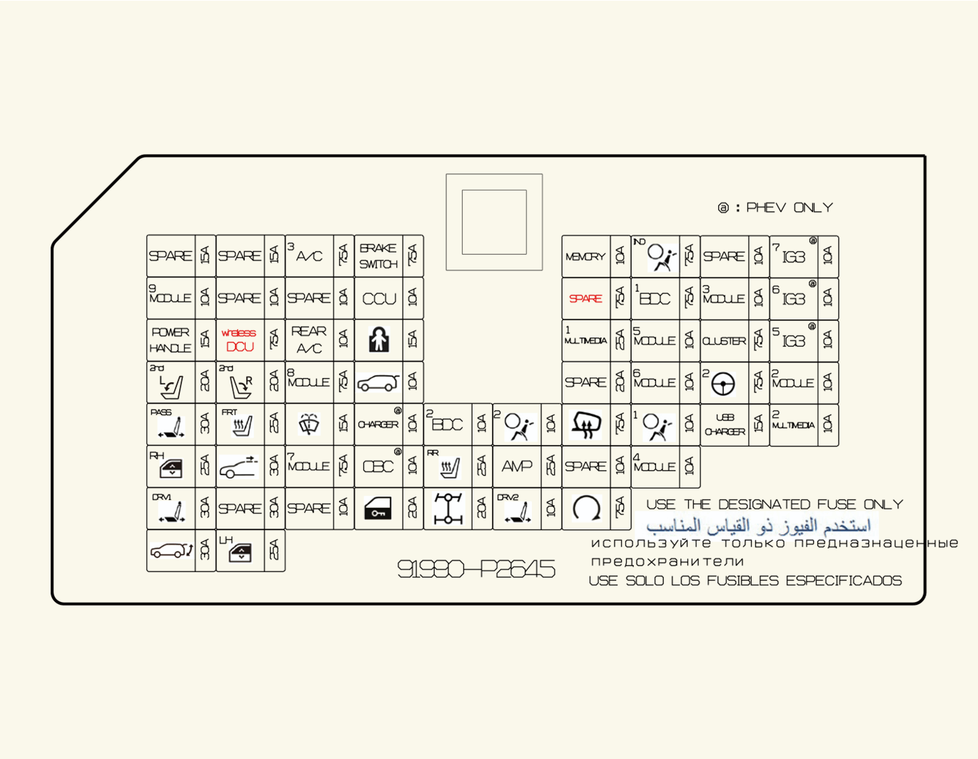 אשכול, יחידת מנורת מצב רוח, מנורת מצב רוח LH/RH, BDC (גוף Contoller), יחידת מצלמה מובנית, HUD, MTC (בקרת טמפרטורה ידנית), DATC (בקרת טמפרטורה אוטומטית כפולה), ADAS PRK ECU, מתג מזגן אחורי |