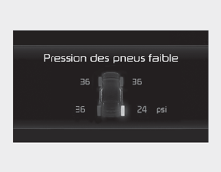 Lorsque les témoins d'avertissement du système de surveillance de la pression des pneus s'allument et qu'un message d'avertissement s'affiche sur l'écran LCD du combiné, cela signifie qu'un ou plusieurs de vos pneus ne sont pas assez gonflés. Le témoin d'identification des pneus sous-gonflés éclaire le pneu sous-gonflé.