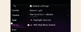 With the vehicle in the ON position, select User Settings → Lights → High Beam Assist in the instrument cluster, or select Settings → Vehicle → Lights → High Beam Assist in the Infotainment system to turn on High Beam Assist function.