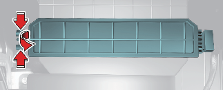 Remove the climate control air filter cover whilst pressing the lock on the right side of the cover.