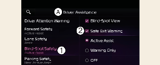 With the vehicle on, select Settings→ Driver Assistance → Blind-Spot Safety→ Safe Exit Warning from the User Settings menu or select Settings→ Vehicle → Driver Assistance → Blind-Spot Safety→ Safe Exit Warningfrom the infotainment system to turn on Safe Exit Warning and deselect to turn off the function.