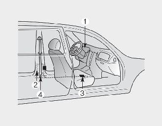 O sistema do pré-tensor de um cinto de segurança consiste principalmente nos componentes seguintes. As respetivas localizações são apresentadas na ilustração: