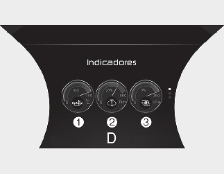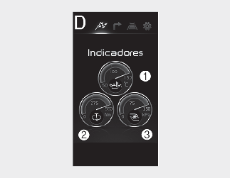 Este modo apresenta a temperatura do óleo (1), o mostrador de torque (2) e o mostrador da pressão do turbo (3).