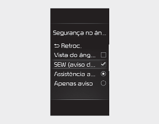 Com o botão ENGINE START/STOP (Ligar/desligar o motor) na posição ON (Ligado), selecione "User Settings (Definições do utilizador) (ecrã LCD) ou Settings (Definições) → Vehicle (Veículo) (ecrã do sistema de infotainment) → Driver Assistance (Assist. ao condutor) → Warning Volume (Volume do aviso)" para mudar o volume do aviso para "High" (Alto), "Medium" (Médio) ou "Low" (Baixo) para o Aviso de saída com segurança.