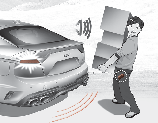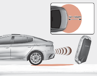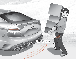 Se estiver posicionado na área de deteção (50 a 100 cm atrás do veículo) com uma Smart Key, as luzes de emergência vão piscar e o sinal sonoro irá soar durante 3 segundos para o alertar que a Smart Key foi detetada e que a porta da bagageira vai abrir.