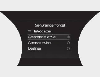 Quando o motor é reiniciado, a Assistência à prevenção de colisão frontal é sempre ligada. No entanto, se for selecionado "Off" (Desligado) após o motor ser reiniciado, o condutor deve ter sempre atenção à área circundante e conduzir em segurança.