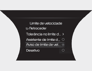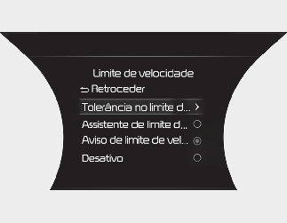 A função de aviso de limite de velocidade é ativada quando a velocidade de marcha ultrapassa o limite de velocidade acrescido do valor de desvio. Defina o valor de desvio para "0" para ativar imediatamente a mensagem de aviso logo que o veículo exceda o limite de velocidade.