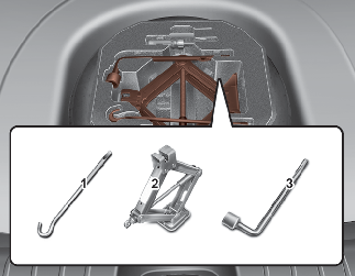 O macaco, a haste do macaco e a chave de rodas estão guardados na bagageira.