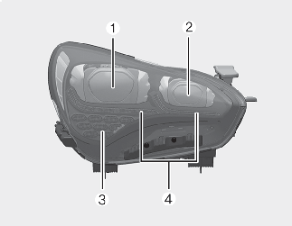 Se as lâmpadas de Máximos/Médios (1), as lâmpadas do sistema de assistência de Médios/Máximos (2), os indicadores dianteiros de mudança de direção (3) ou as luzes de circulação diurna/luz de presença(4) não estiverem a funcionar, mande verificar o veículo numa oficina profissional.