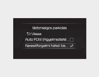 Az ENGINE START/STOP ON állapotában válassza a 'Driver Assistance → Parking Safety → Rear Cross-Traffic Safety' (Vezetősegéd → Parkolási biztonság→ Keresztforgalmi hátsó biztonság) elemet a Beállítások menüből a Hátsó keresztforgalmi ütközés elkerülése segéd bekapcsolásához és törölje a kijelölést a funkció kikapcsolásához.