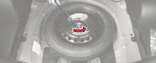 Tournez le boulon à ailettes de retenue du pneu dans le sens contraire des aiguilles d’une montre. S’il est difficile de dévisser à la main le boulon à ailettes de retenue du pneu, vous pouvez le desserrer à l'aide de la manivelle du cric.