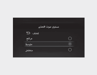 ومع ذلك، في حالة تحديد "Off" (إيقاف تشغيل) (إن وجدت وظيفة اهتزاز عجلة القيادة)، لن يتم إيقاف تشغيل مستوى صوت تحذير الوظيفة ولكن سيتم ضبط مستوى الصوت على "Low" (منخفض).