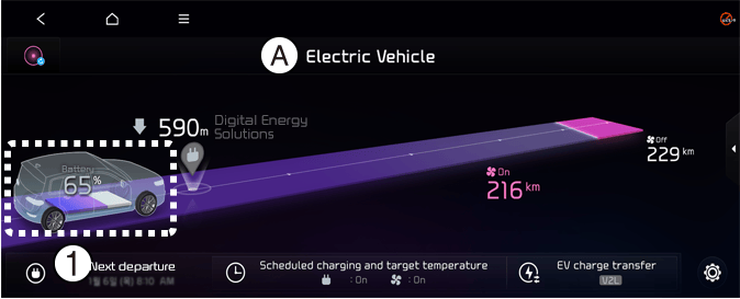 Na obrazovce vyberte možnost EV → Next Departure (Další odjezd). Nastavit lze datum a čas plánovaného nabíjení akumulátoru, teplotu klimatizace a různé další funkce.