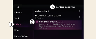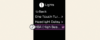 Při zapnutém vozidle zapnete asistenta dálkových světel výběrem položky Lights (Světla) → HBA (High Beam Assist) (Asistent dálkových světel) z nabídky Settings (Nastavení).