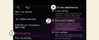 Při nastartovaném vozidle stiskněte Settings (Nastavení) → Driver Assistance (Jízdní asistent) → Driving Safety (Bezpečnost jízdy) na přístrojovém panelu nebo Settings (Nastavení) → Vehicle (Vozidlo) → Driver assistance (Jízdní asistent) → Blind-spot safety (Detekce mrtvého úhlu) na informačním a zábavním systému.