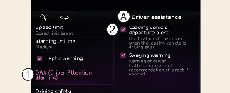 Při nastartovaném vozidle vyberte Settings (Nastavení) → Driver Assistance (Jízdní asistent) → DAW (Driver Attention Warning) (Systém sledování bdělosti řidiče) na sdruženém přístroji nebo Settings (Nastavení) → Vehicle (Vozidlo) → Driver assistance (Jízdní asistent) → DAW (Driver Attention Warning) (Systém sledování bdělosti řidiče) na informačním a zábavním systému.