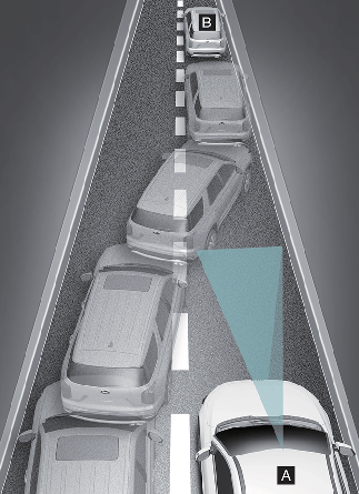 Když se do vašeho jízdního pruhu zařadí ze sousedního jízdního pruhu jiné vozidlo, systém je nedokáže rozpoznat, dokud není v rozpoznávacím rozsahu senzoru. Adaptivní tempomat nemusí ihned rozpoznat vozidlo, pokud náhle přejede do jiného jízdního pruhu. V takovém případě je nutné dodržovat bezpečnou brzdnou vzdálenost, a pokud je to nutné, snížit rychlost jízdy mírným sešlápnutím brzdového pedálu, aby byl neustále zachován bezpečný odstup.