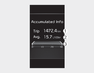 Ta zaslon prikazuje razdaljo potovanja (1), povprečno učinkovitost goriva (2) in informacije o trenutni varčni porabi goriva (3) glede na en cikel vžiga.