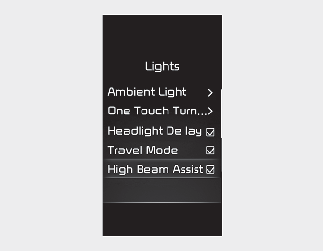 Če izberete »User Settings (Uporabniške nastavitve) na zaslonu LCD ali Settings (Nastavitve) → Vehicle (Vozilo) na zaslonu informacijsko-razvedrilnega sistema → Lights (Luči) → HBA (High Beam Assist) (Asistenca za dolge luči)« na zaslonu LCD instrumentne plošče ali v meniju Settings (Nastavitve) na zaslonu informacijsko-razvedrilnega sistema, ko je motor vklopljen, lahko izberete ali sprostite funkcijo. Nastavitve se ohranijo tudi pri izklopljenem in vklopljenem motorju.