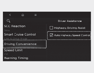 Ko je gumb ENGINE START/STOP (Zagon/ustavitev motorja) v položaju ON (Vklop), izberite ‘Driver Assistance → Warning Volume’ iz “User Settings (LCD zaslon) ali Settings → Vehicle (Infotainment System zaslon)“, da spremenite glasnost za pomočnika pri vožnji po avtocesti na ‘Glasno’, ‘Srednje’ in ‘Tiho’.