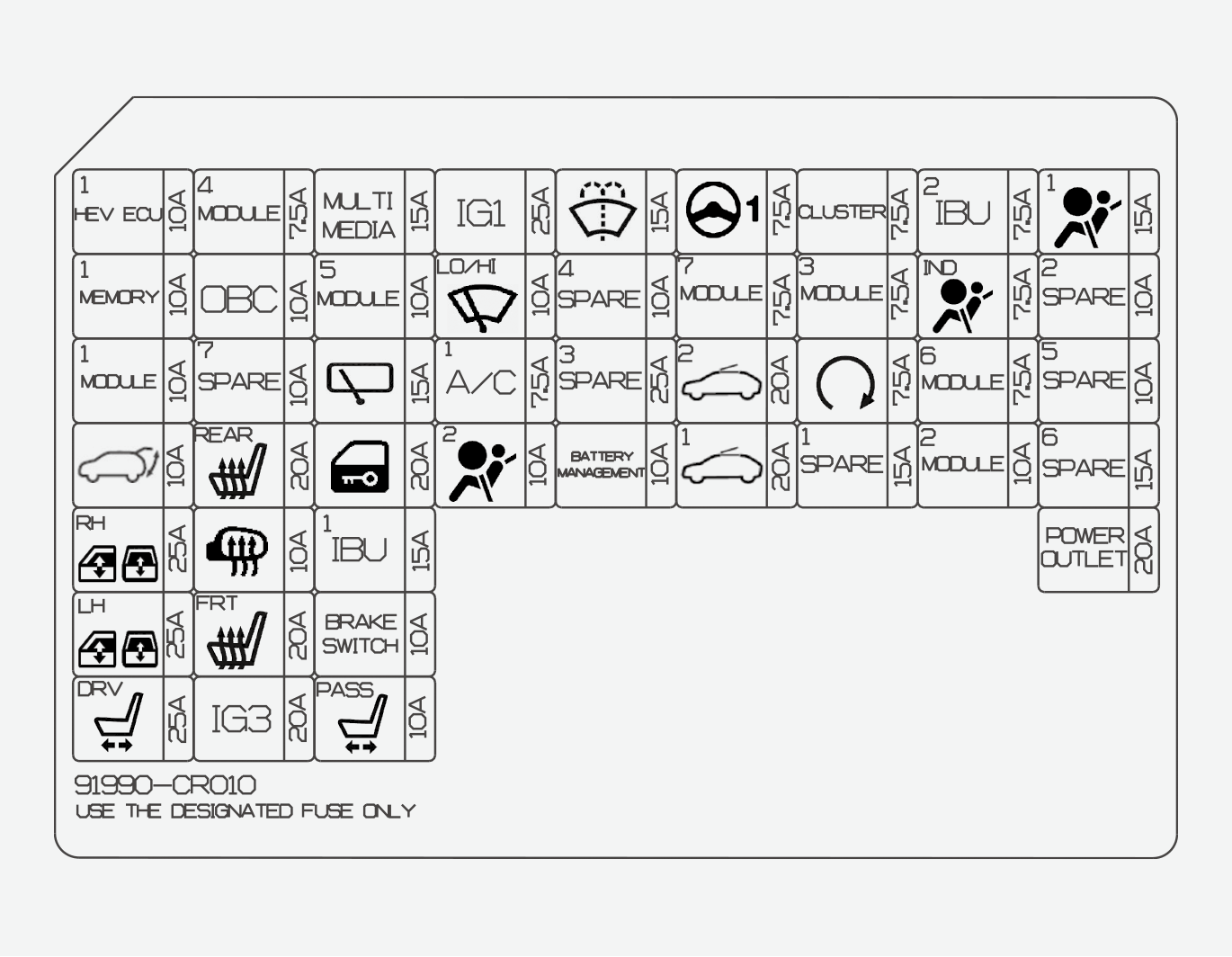 ICU-Klemmenblock (Sicherungsname: Heckklappe, P/WDW rechts, P/WDW rechts, P/Fahrersitz, S/Heizung vorn, IG3, P/Beifahrersitz, MDPS (elektrische Servolenkung), Schiebedach 2, Schiebedach 1) |