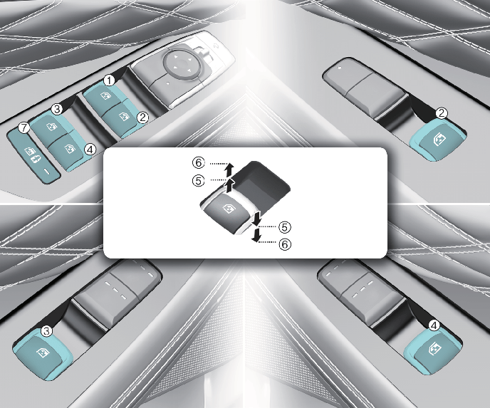 يتوفر لباب السائق مفتاح رئيسي لتشغيل النوافذ الكهربائية والذي يتحكم في جميع نوافذ السيارة.