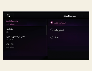 يمكن تشغيل اهتزاز عجلة القيادة أو إيقاف تشغيلها (إذا كانت السيارة مجهزة بذلك). حدد أو ألغ التحديد من "Driver Assistance (مساعدة السائق) ← Haptic Warning (تحذير التلامس)" من قائمة الإعدادات.