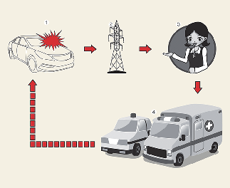 *2. تعني "الحوادث الأخرى" أي حادثة تقع على طرق الشرق الأوسط (فقط في الدول التي لديها لوائح تتعلق بهذا النظام) ينتج عنها وجود جرحى أو ضرورة تقديم المساعدة. في حالة تسجيل أي حادث، من الضروري إيقاف السيارة، والضغط على زر SOS (موقع الزر محدد في الصورة في تفاصيل أكثر. عند إجراء مكالمة، يَجمَع النظام معلومات عن السيارة (من أي مكان تتم منه المكالمة)، ثم يوصّل السيارة بعد لك بأحد موظفي نقطة الرد المتعلقة بالسلامة العامة (PSAP) لإخباره بشأن سبب المكالمة الطارئة.