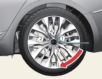 ثم ضع مفتاح الربط على النحو الموضح في الرسم واربط صواميل العجلة. تأكد من تثبيت المقبس تمامًا على الصامولة. لا تقف على مقبض مفتاح الربط أو تستخدم أنبوب إطالة على مقبض مفتاح الربط. انتقل بين صواميل العجلة مع إحكام ربط كل صامولة حتى يتم ربط جميع الصواميل بإحكام. ثم تحقق من إحكام ربط كل صامولة مرة أخرى. بعد تغيير العجلات، افحص النظام لدى ورشة محترفة. تُوصي Kia بزيارة أحد شركاء خدمة/وكلاء Kia المعتمدين.
