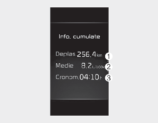 Acest afișaj arată distanța de deplasare (1), eficiența medie a combustibilului (2) și informații privind timpul total de conducere (3) o dată la fiecare ciclu de pornire.