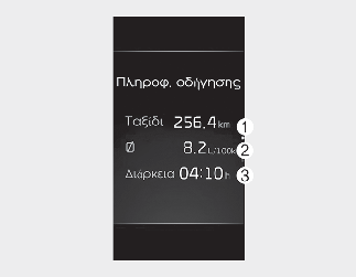 Acest afișaj arată distanța de deplasare acumulată (1), eficiența medie a combustibilului (2) și timpul total de conducere (3).