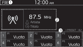 Scan (Scansione): Il sistema cerca le stazioni radio con un forte segnale radio e riproduce ogni stazione radio per circa cinque secondi.