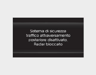 Quando l'Avviso collisione traffico di attraversamento posteriore non funziona correttamente, sul quadro strumenti apparirà il messaggio 'Verificare i sistema di sicurezza per il traffico di attraversamento posteriore' e la funzione si disattiverà automaticamente o sarà limitata. Si consiglia di far ispezionare il veicolo da un concessionario/centro di assistenza partner autorizzato Kia.