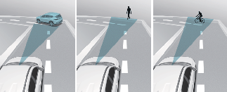 L’illustration ci-dessus montre l’image que la caméra de vision frontale et le radar avant sont capables de détecter comme étant un véhicule, un piéton et un cycliste.