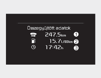 Ez a kijelző a teljes megtett utat (1), az átlagos üzemanyag-hatékonyságot (2), és a teljes vezetési időt (3) mutatja tankolás után.