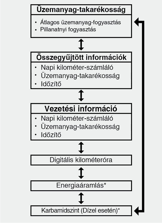A rendszer az átlagfogyasztást a számláló utolsó visszaállítása óta megtett teljes távolság és elfogyasztott üzemanyag-mennyiség alapján számítja ki.