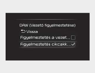 Az ENGINE START/STOP (Motor be/ki) gomb ON (Be) állásában válassza a “User Settings (Beállítások) → Driver Assistance (Vezetéssegítő rendszer) → Driver Attention Warning (Vezető figyelmeztetése)” opciót az LCD-kijelzőn vagy az infotainment rendszeren az egyes funkciók használatához, vagy törölje a kiválasztást a funkció kikapcsolásához.