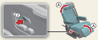 握住腿部支撐,調整腿部支撐的角度 (1, 2) 和長度 (3, 4)。使用腿托時,將座椅移動至內側位置,然後向後調整。如果沒有將座椅移動至靠後的位置,它可能與第一排座椅接觸。