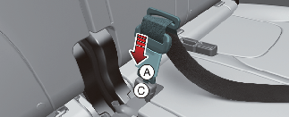 將迷你舌形板 (A) 插入固定錨連接器 (C) 的開口端,直至聽到「咔嗒」聲,即表示鎖緊。確認安全帶沒有扭結。