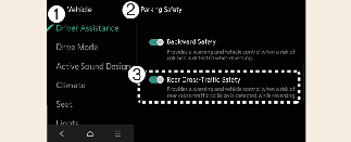 車輛啟動時,在資訊娛樂系統畫面中選取設定→車輛→駕駛輔助→停車安全→後方橫向車流安全系統,以開啟後方橫向車流防撞輔助系統。