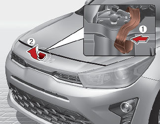 Vaya a la parte delantera del vehículo, eleve el capó ligeramente, después tire del enganche (1) interior del centro del capó y levante el capó (2).