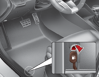 La compuerta de llenado de combustible debe abrirse desde el interior del vehículo tirando de la palanca de la compuerta de llenado de combustible ubicada en la zona del suelo delantero debajo del asiento del conductor.